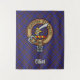 Clan Elliot crest badge surrounded by a strap and buckle over modern tartan background. Custom text.