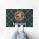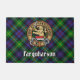 Clan Farquharson crest badge surrounded by a strap and buckle over tartan background. Custom text.