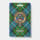 Clan Ferguson crest badge surrounded by a strap and buckle over tartan background. Custom text.