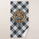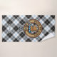 Clan Forbes crest badge surrounded by a strap and buckle over dress tartan background. Custom text on each towel.