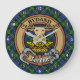 Clan Gordon crest badge surrounded by a strap and buckle over tartan background. Custom text.
