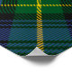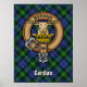 Clan Gordon crest badge surrounded by a strap and buckle over tartan background. Custom text.