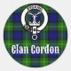 Show your Scottish pride! Clan Gordon crest badge with text on background of clan tartan.