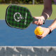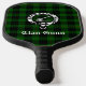 Pickleball paddle featuring Scottish Clan Gunn Crest Badge and text on tartan background.