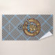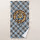 Clan Haig crest badge surrounded by a strap and buckle over check tartan background. Custom text on each towel.