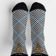 Clan Haig crest badge surrounded by a strap and buckle over check tartan background. Custom top stripe colour. Custom text on each sock.
