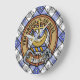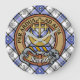 Clan Hannay crest badge surrounded by a strap and buckle over tartan background. Custom text.