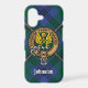 Clan Johnston crest badge surrounded by a strap and buckle over tartan background. Custom text.