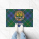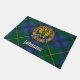 Clan Johnston crest badge surrounded by a strap and buckle over tartan background. Custom text.