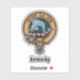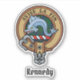 Clan Kennedy crest badge surrounded by a strap and buckle over tartan background. Custom text.
