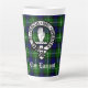 Latte mug with Scottish Clan Lamont Crest Badge and customisable text on tartan background.