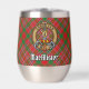Clan MacAlister crest badge surrounded by a strap and buckle over tartan background. Custom text on both sides.
