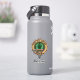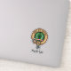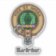 Clan MacArthur crest badge surrounded by a strap and buckle over tartan background. Custom text.