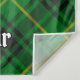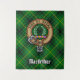 Clan MacArthur crest badge surrounded by a strap and buckle over tartan background. Custom text.