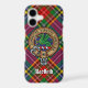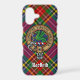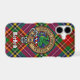 Clan MacBeth crest badge surrounded by a strap and buckle over tartan background. Custom text.