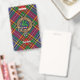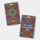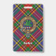 Clan MacBeth crest badge surrounded by a strap and buckle over tartan background. Custom text.