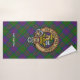 Clan MacDonald crest badge surrounded by a strap and buckle over tartan background. Custom text on each towel.