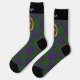 Clan MacDonald crest badge surrounded by a strap and buckle over tartan background. Custom top stripe colour. Custom text on each sock.