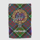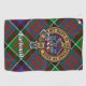 Clan MacDonald of Clanranald crest badge surrounded by a strap and buckle over tartan background. Custom text.