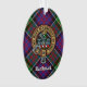 Clan MacDonald of Clanranald crest badge surrounded by a strap and buckle over tartan background. Custom text on both sides.