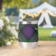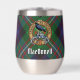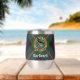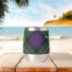 Clan MacDonell of Glengarry crest badge surrounded by a strap and buckle over tartan background. Custom text on both sides.