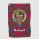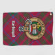 Clan MacDougall crest badge surrounded by a strap and buckle over tartan background. Custom text.