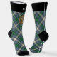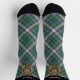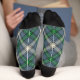 Clan MacDowall crest badge surrounded by a strap and buckle over tartan background. Custom top stripe colour. Custom text on each sock.
