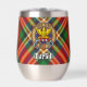 Clan MacGill crest badge surrounded by a strap and buckle over tartan background. Custom text on both sides.