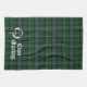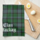Stylish kitchen towel features Scottish Clan Mackay crest badge with tartan background and customisable text in Old World style font