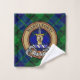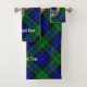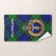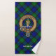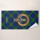 Clan MacKay crest badge surrounded by a strap and buckle over tartan background. Custom text on each towel.