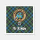 Clan MacKenzie crest badge surrounded by a strap and buckle over tartan background. Custom text.