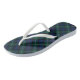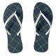 Flip flops with the Clan Mackenzie tartan, a traditional Scottish plaid pattern in shades of forest green and blue with black, red and white accents.