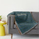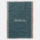 Colourful custom fringe end throw blanket made with graphics of the blue, green, and black clan MacKirdy tartan plaid pattern. Cream coloured old world style text can be personalised to read what you want. Lovely gift idea for anyone.