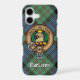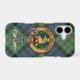 Clan MacLaren crest badge surrounded by a strap and buckle over tartan background. Custom text.