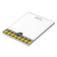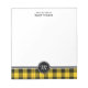 Personalised note pad with a plaid border and monogram. Traditional Scottish plaid pattern in bright yellow and black, with red accents.