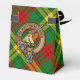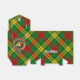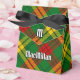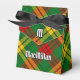 Clan MacMillan crest badge surrounded by a strap and buckle over tartan. Custom text and monogram.