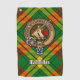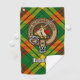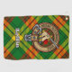 Clan MacMillan crest badge surrounded by a strap and buckle over tartan background. Custom text.