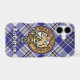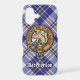 Clan MacPherson crest badge surrounded by a strap and buckle over blue dress tartan background. Custom text.