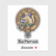 Clan MacPherson crest badge surrounded by a strap and buckle over blue dress tartan background. Custom text.