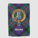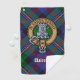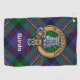 Clan Malcolm or MacCallum crest badge surrounded by a strap and buckle over tartan background. Custom text.