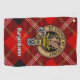 Clan Marjoribanks crest badge surrounded by a strap and buckle over tartan background. Custom text.