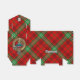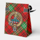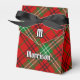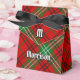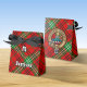 Clan Morrison crest badge surrounded by a strap and buckle over red tartan background. Custom text and monogram.