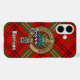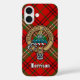 Clan Morrison crest badge surrounded by a strap and buckle over red tartan background. Custom text.