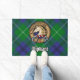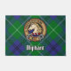 Clan Oliphant crest badge surrounded by a strap and buckle over tartan background. Custom text.