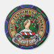 Clan Paterson crest badge surrounded by a strap and buckle over tartan background. Custom text.