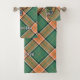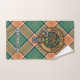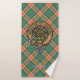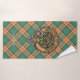 Clan Pollock crest badge surrounded by a strap and buckle over tartan background. Custom text on each towel.