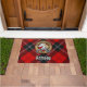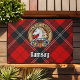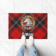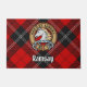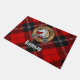 Clan Ramsay crest badge surrounded by a strap and buckle over red tartan background. Custom text.