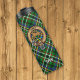 Clan Scott crest badge surrounded by a strap and buckle over green tartan background. Custom text.