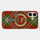 Clan Scott crest badge surrounded by a strap and buckle over red tartan background. Custom text.