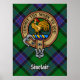 Clan Sinclair crest badge surrounded by a strap and buckle over hunting tartan background. Custom text.